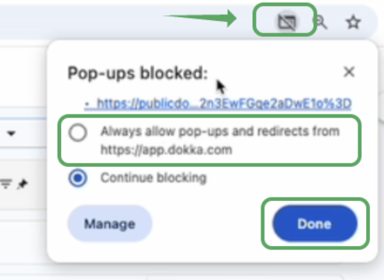 If you’ve clicked “Download” but the files aren’t being saved to your computer, your browser may be blocking pop-up downloads from DOKKA.