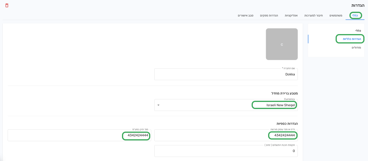 באותו עמוד יש להגדיר את המטבע הראשי שבו החברה עובדת.